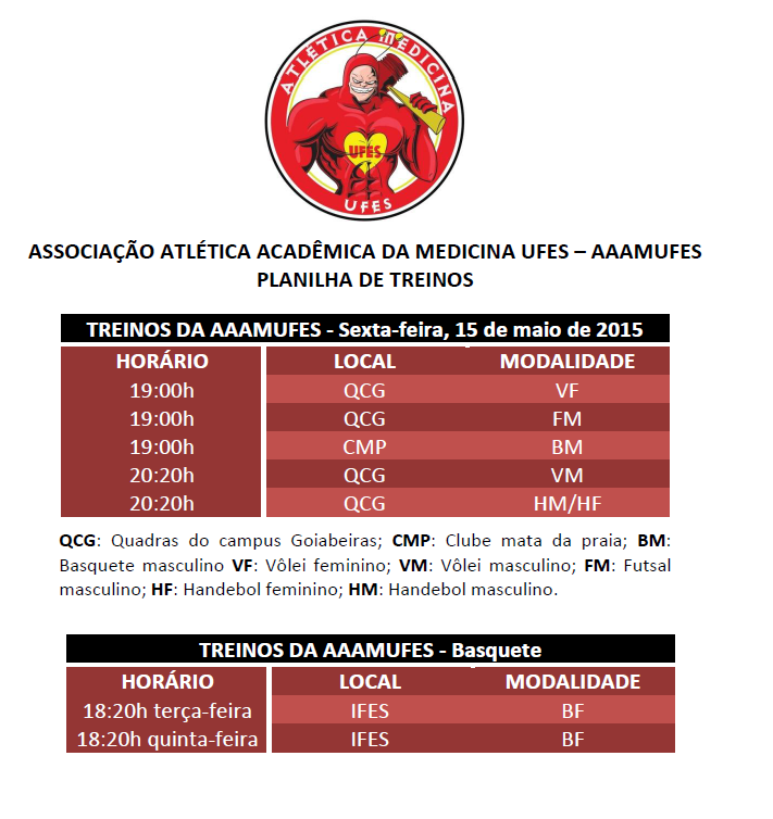 Os treinos de natação são realizados no parque aquático da UFES de goiabeiras, de segunda a quinta. Os demais treinos acontecem na quadra da UFES de goiabeiras, na quadra de bairro república e na quadra do clube mata da praia, de acordo com a tabela abaixo.